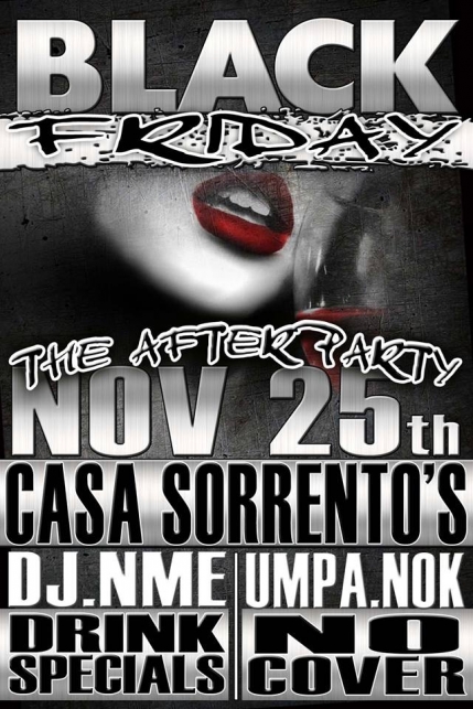 Black Friday After Party hosted by Umpa Nok!! Here to release the tension of hard core shopping! DJ NME spinning all the best of Old School, Top 40, Mainstream & much more. For those of you who don't miss a great deal, there will be Black Friday Drink Specials!!! 21+ Event!