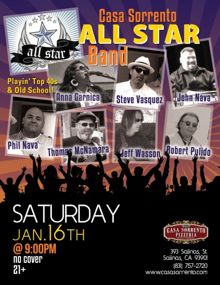 SEASONED musicians, Steve Vasquez, Robert Pulido, Anna Garnica, The Nava Brothers, Ruben Jr., & others have collaborated with Casa Sorrento to put together THE CASA SORRENTO ALL STAR BAND will be an EPIC night of dancing. These seasoned Monterey County musicians have played together and separately with the BTA Band, Chicano All Star Band, Nu Horizon, Lang Street and many many others just to name a few. Playing R & B, Old School, Funk & Latin will keep you dancing all night long, you won't want to miss this event.