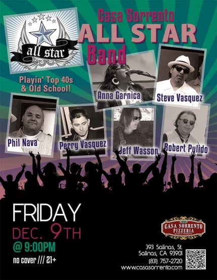 EASONED musicians, Steve Vasquez, Robert Pulido, Anna Garnica, Phil Nava, Ruben Jr., Perry Vasquez & others have collaborated with Casa Sorrento to put together THE CASA SORRENTO ALL STAR BAND will be an EPIC night of dancing. These seasoned Monterey County musicians have played together and separately with the BTA Band, Chicano All Star Band, Nu Horizon, Lang Street and many many others just to name a few. Playing R & B, Old School, Funk & Latin will keep you dancing all night long, you won't want to miss this event.