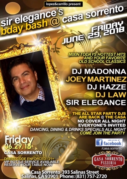 Friday June 29th the Party is @ #CasaSorrento!! It's my Bday Celebration and Everyone's Invited!!! DJ Madonna Varela, Joey Martinez, #DjHazze aka Carl Gilkey, #DjLaw & Yours Truly will be in the mix spinning the best old school & todays hottest hits!!! No Cover All Night 21+ w/ID / Music starts at 9pm #LetTheMusicPlay #ComeJoinTheParty #ThePartyIsAtCasa