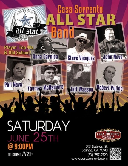 SEASONED musicians, Steve Vasquez, Robert Pulido, Anna Garnica, The Nava Brothers, Ruben Jr., & others have collaborated with Casa Sorrento to put together THE CASA SORRENTO ALL STAR BAND will be an EPIC night of dancing. These seasoned Monterey County musicians have played together and separately with the BTA Band, Chicano All Star Band, Nu Horizon, Lang Street and many many others just to name a few. Playing R & B, Old School, Funk & Latin will keep you dancing all night long, you won't want to miss this event.